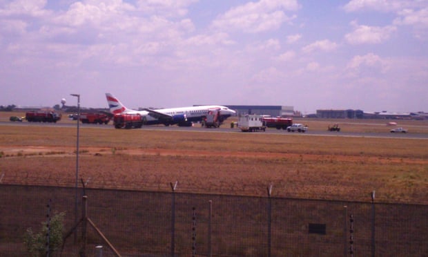 Emergency services rush in aid of British Airways Comair Boeing 737 after it came to a standstill on the runway of OR Tambo airport in Johannesburg. Photograph: Lina Lekgothwane/Demotix/Corbis